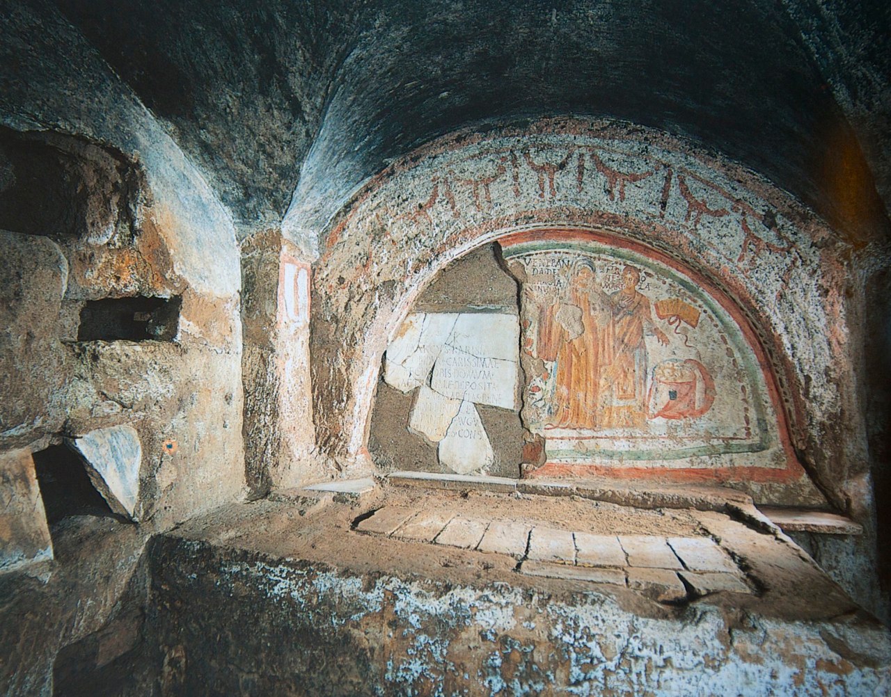 According to the 'Itineraries' the tomb of the famous martyr Petronilla lay behind the altar which covered the remains of Nereus and Achilles. The explorers were able to verify this indication. In a cubiculum behind the apse of the basilica, and approached by a short passage, a fresco was discovered on the wall filling the front part of the 'arcisolium' where the sarcophagus had lain; the painting showing two female figures standing, an elder and a younger woman with their names inscribed