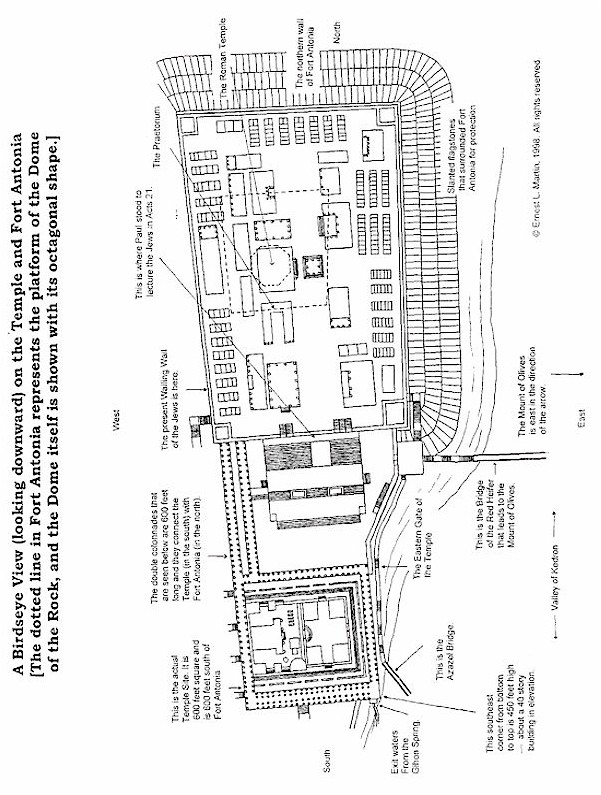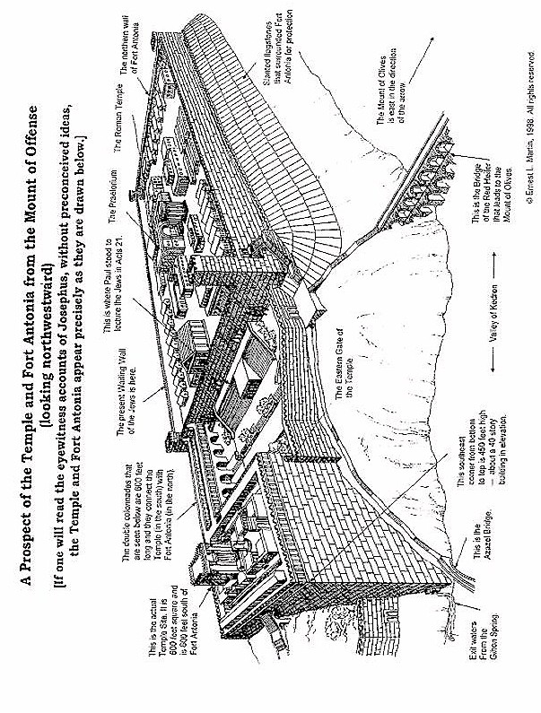 What you are about the see in the illustrations at the conclusion of this Report is the description of the Temple and Fort Antonia as presented by Josephus, the Judahite historian. He was an eyewitness to the City of Jerusalem before the Romans destroyed it in A.D.70. I have had our artist draw both a horizontal aspect as though you would view the buildings from above (in outline form as an architect would draw the edifices), and also to show a vertical aspect that gives a three dimensional effect as seen from the east side of the buildings.