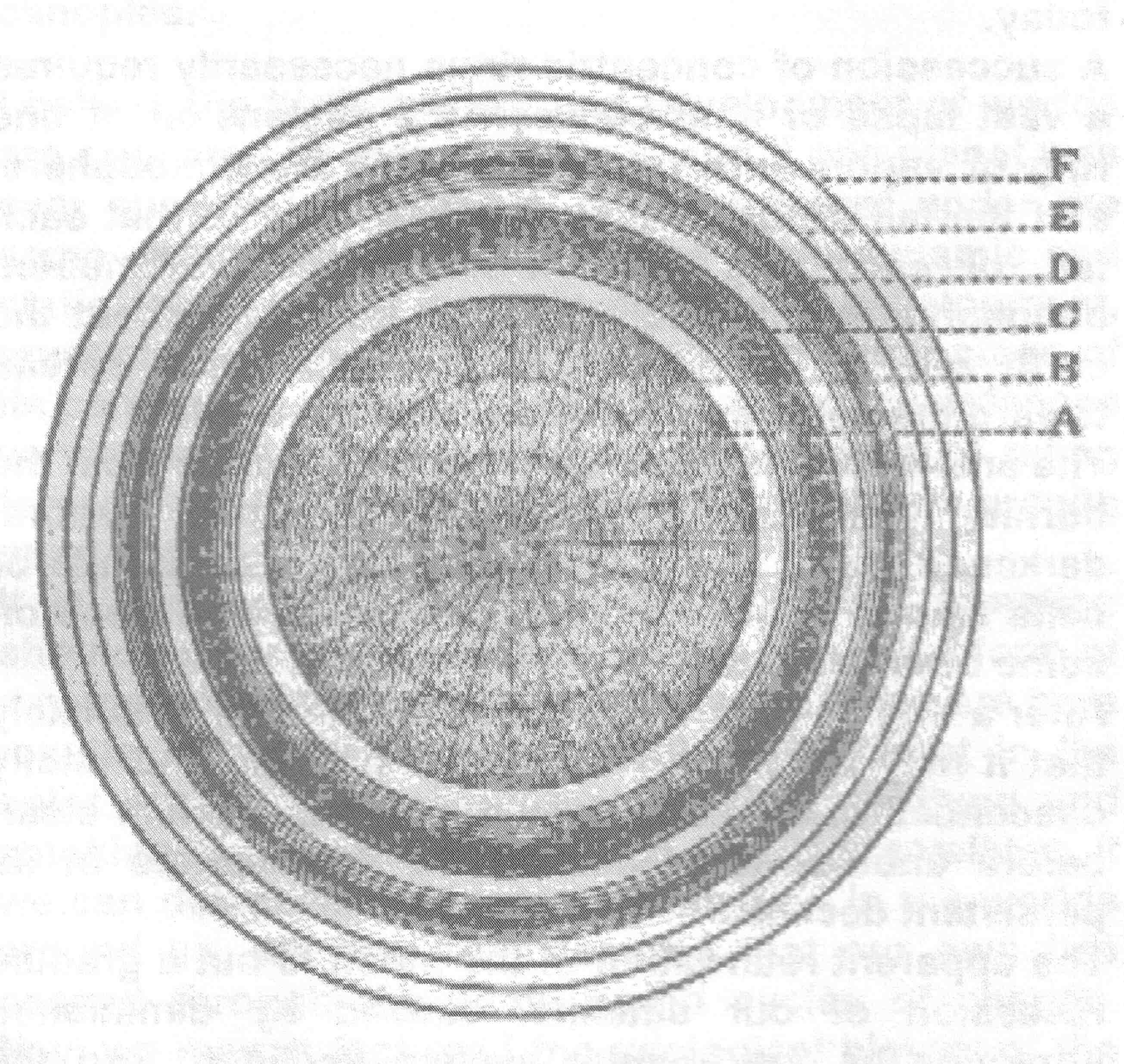 "This illustration [to the left] shows a full-face view of the earth and its annular system. Here A is the earth, B the earth's atmosphere, C the heavy carbons and their accompanying mineral sublimations, D the lighter carbons and hydro-carbons, E glacial snows and their accompaniments, F outer vapors, principally aqueous and likely in a frozen state. From this outermost ring came the polar snows that chilled the Eden earth, and afterwards caused the deluge.