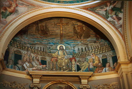 The mosaic in the great apse of the Basilica of St. Pudentiana in Rome shows major Jerusalem landmarks ca. 400. Located at 160 Via Urbana in Rome, presumably built over the house of Roman senator Rufus Pudens (sometimes thought to be the Rufus of Romans 16:13 and Pudens of II Timothy 4:21).