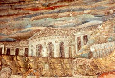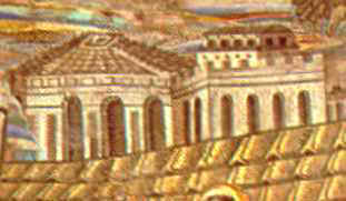 Above is a section of the mosaic in the apse of Basilica of St. Pudentiana. The building to the immediate right of Jesus' head is the Octagonal Memorial Church built by Theodosius I (ca. 382). To its immediate right is the Church of the Apostles, incorporating the original the small synagogue building, as it appeared about CE 400. A BIBARCH™ Photo.