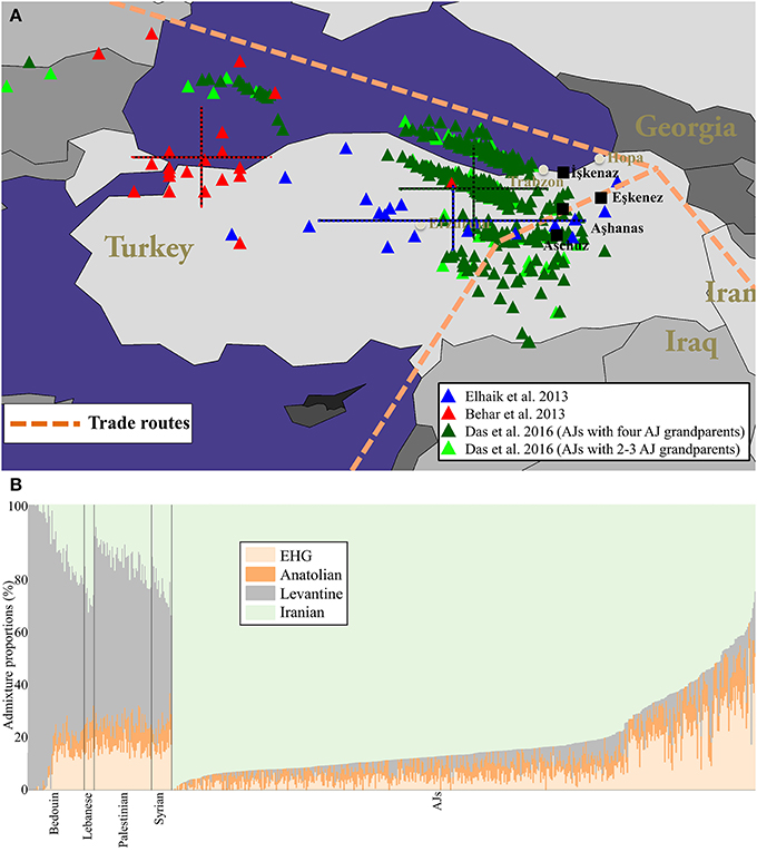 Ashkenazic Jews were predicted to a Near Eastern hub of ancient trade routes that connected Europe, Asia, and the northern Caucasus (Das et al., 2016). The findings imply that migration to Europe took place initially through trade routes going west and later through Khazar lands. |