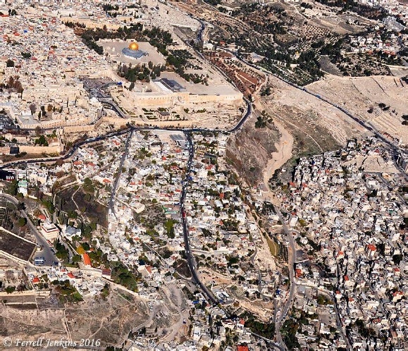 Fig. 3. The photo shows how the southeastern hill is curved or “bending back,” like “a moon when she is horned” or would have had its towers arranged in “the manner of a theater.” The Gihon Spring is where buildings begin south of the very steep slopes. Note that the traditional temple mount’s east wall cannot be considered “within the valley,” as described by Josephus. [Courtesy of Ferrell Jenkins]