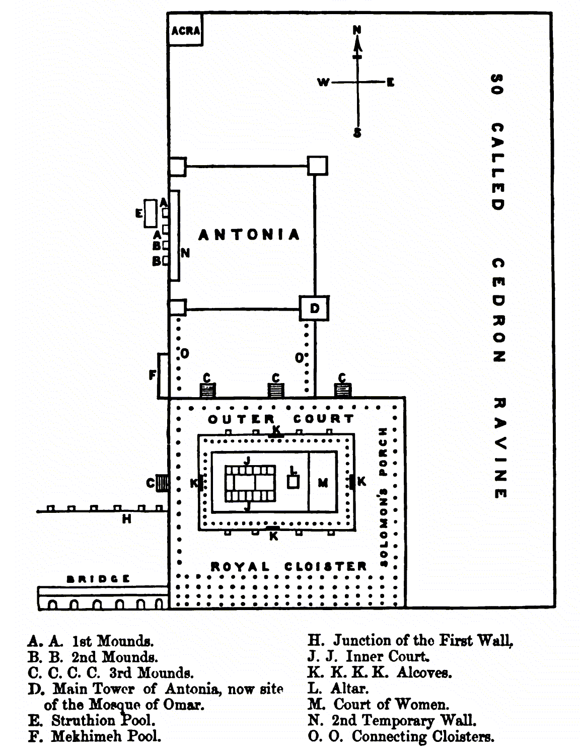 As the sacred edifice was the heart of Jerusalem, from which all its pulsations issued, Herod’s object was to place it under military control, and this was effected by means of two connecting cloisters or colonnades parallel to each other. One of them ran from the south-west corner of Antonia to the north-west corner of the temple. The other parallel cloister started from south-east corner of Antonia, and ran to a point in the northern cloister of the temple, about 475 feet from the western end, and 125 feet from the eastern end. Thus the troops quartered in the fortress had free access along the two parallel colonnades to the cloisters of the temple, either along the flat roofs, or along the galleries below (p. 65).