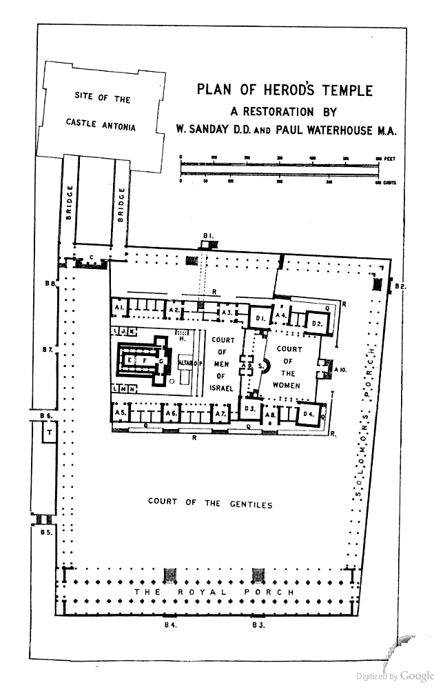 This greatly dispirited the Jews, for an old prophecy ran: When square the walls, the temple falls. And now, this had come to pass. The Temple had comprised not only the outer court, a regular square of 600 feet, but also Antonia, which was united to the Temple by the connecting parallels, and so gave it a an irregular configuration; but now that the parallels were broken away, the Temple was seen to stand an isolated square, and the morbid imaginations of the beholders already pictured the holy fabric enveloped in flames (pp. 70-71).