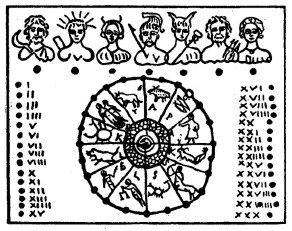 The above drawing of a stick calendar found at the Baths of Titus (constructed A.D. 79 – 81) provides further proof that neither the Biblical Sabbath nor the day of Christ's resurrection can ever be found using the Julian calendar. The center circle contains the 12 signs of the zodiac, corresponding to the 12 months of the year. The Roman numerals in the left and right columns indicate the days of the month. Across the top of the stick calendar appear the seven planetary gods of the pagan Romans. Saturday, (or dies Saturni -- the day of Saturn) was the very first day of the week, not the seventh.