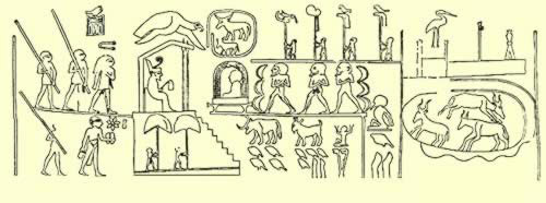 Beneath these figures are symbols of numbers. The numbers have been recently interpreted to indicate 400,000 cattle, 1,422,000 small animals, and 120,000 men (not women and children, only males.) This would have provided for a total human population of the Delta of perhaps 600,000.