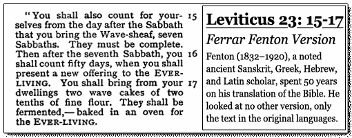 When you consult the original Hebrew of Leviticus 23:15-16, it soon becomes apparent that Ferrar Fenton's translation is the CORRECT one! The Hebrew not only shows the gross error of almost all of the English translations, but also a deliberate hiding of the ACTUAL instructions given by YEHOVAH God to determine the date of His Feast of Shavuot.